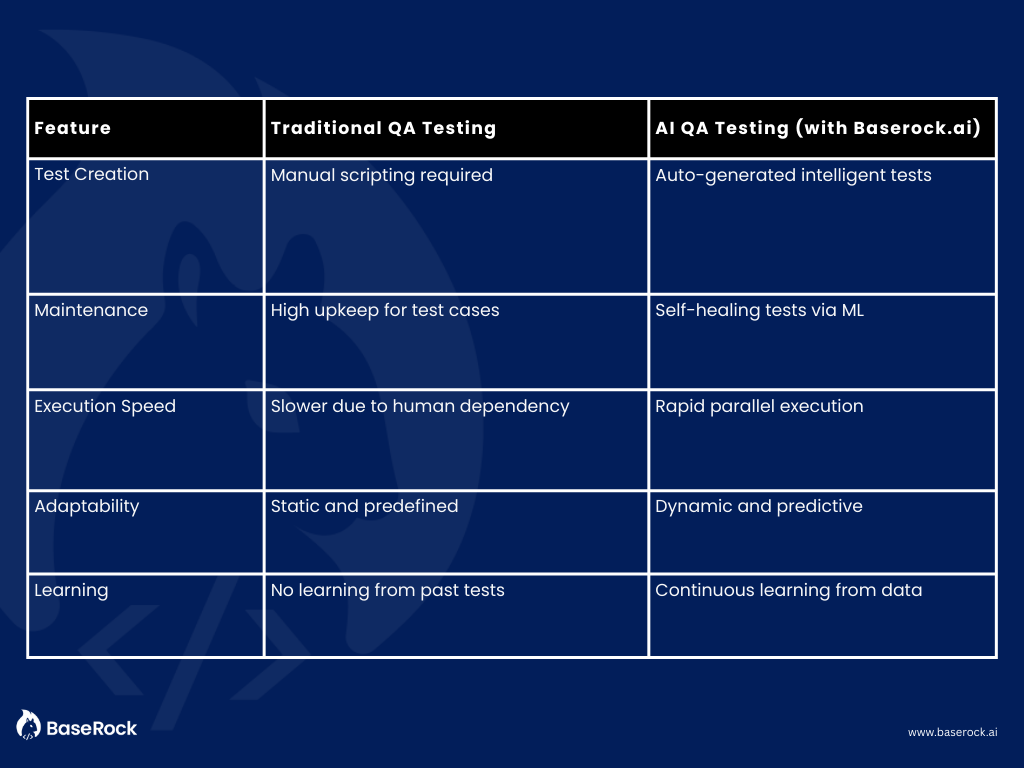 That’s where AI in QA testing comes in. Artificial intelligence is revolutionizing how QA engineers design, execute, and analyze tests. Platforms like Baserock.ai use AI-driven automation to create, run, and maintain tests intelligently — reducing manual effort while boosting accuracy. This transformation marks a new era of continuous, predictive, and adaptive testing.