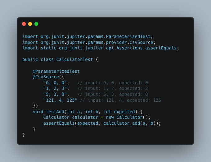 Now, let's create a test class using JUnit 5's @ParameterizedTest feature. We'll test the add method with different sets of inputs and expected outputs.